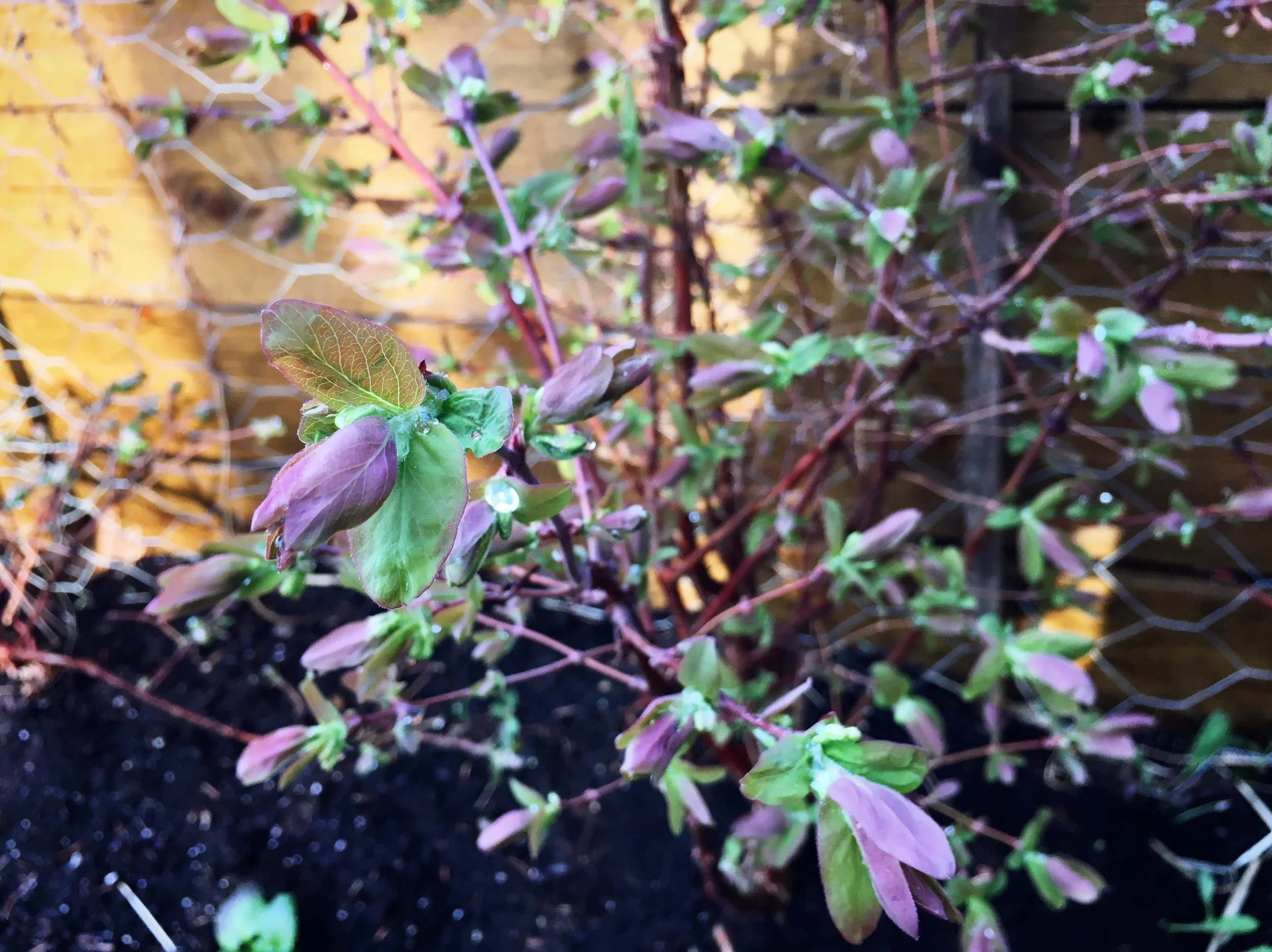 Haskap bushes in my old garden just as they start to get their leaves in the spring.